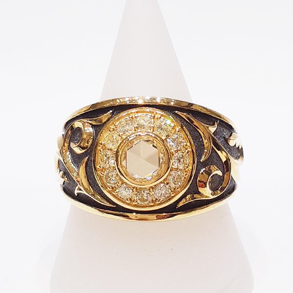 ローズカットのダイヤモンドをまるでお花のようにメレダイヤで囲み、周りには植物の葉をレリーフした華やかなリングです。