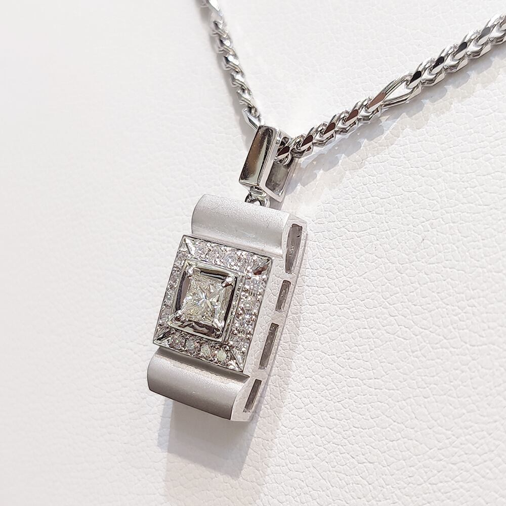スクエアのプリンセスカットのダイヤモンドを中央に埋め込んだ個性的なペンダントトップ。